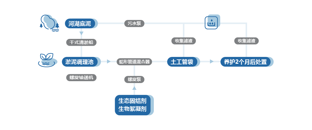 根据河道的污染情况及水质情况,选择合适的挖泥船,快速有效的将河堤淤泥和污染物从水域中分离出来,控制污染扩散,减少清淤过程的二次污染并尽可能保障清淤效率。将挖掘出来的淤泥及污染物,采用机械一体化以及土工管道技术配合生态调理药剂,将淤泥快速有效脱水固结减量,减轻二次污染,降低运输处理成本。